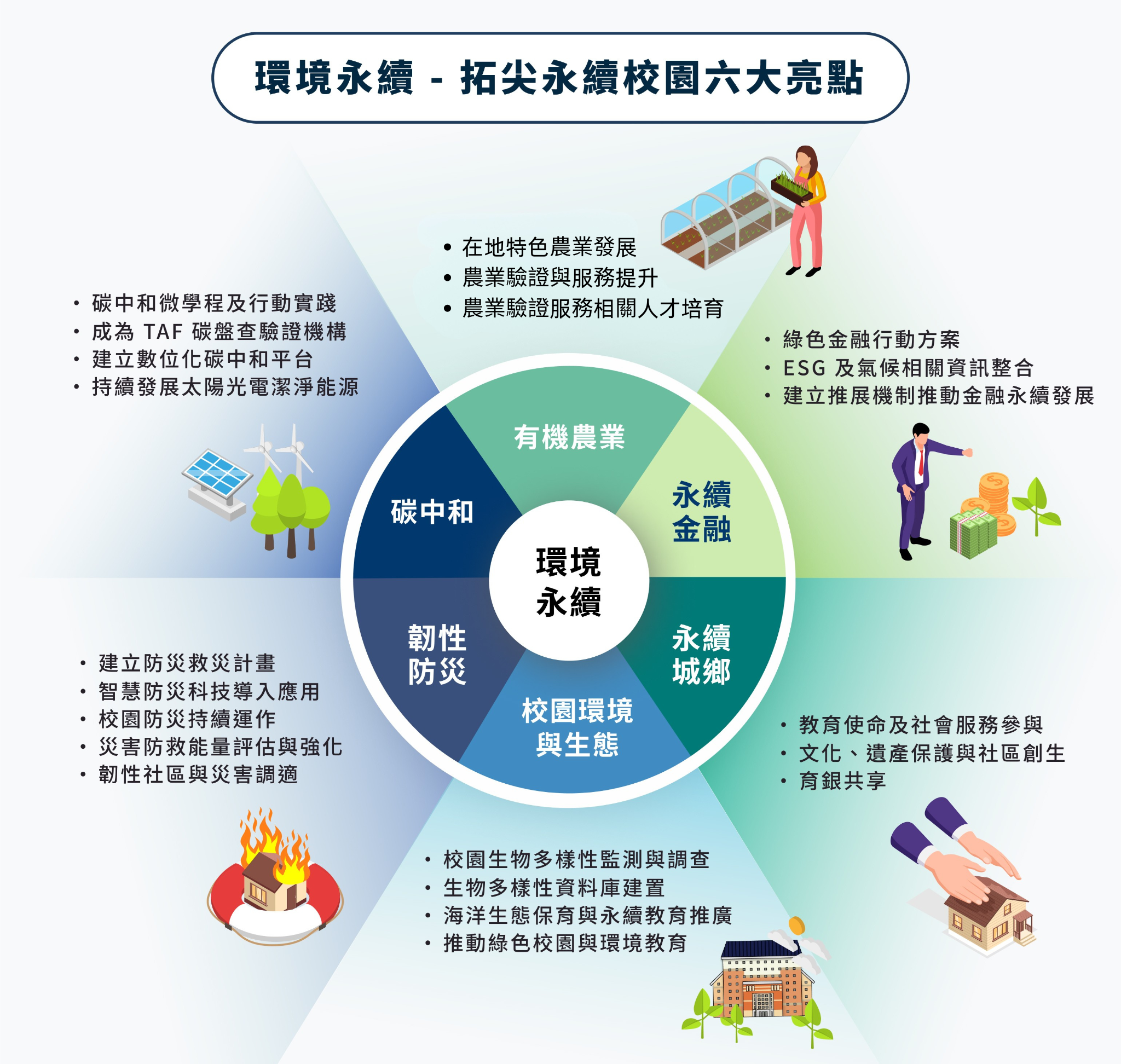 藉由計畫推動和擷取在地生態、文化特色之優勢,推動校園環境保護與永續城鄉保存,增加學生對碳中和永續發展與有機農業之基礎能力與專業知識,並規劃韌性社區與永續金融相關課程,希望藉由本分項提升本校課程、學生學習成效及在地連結強度。