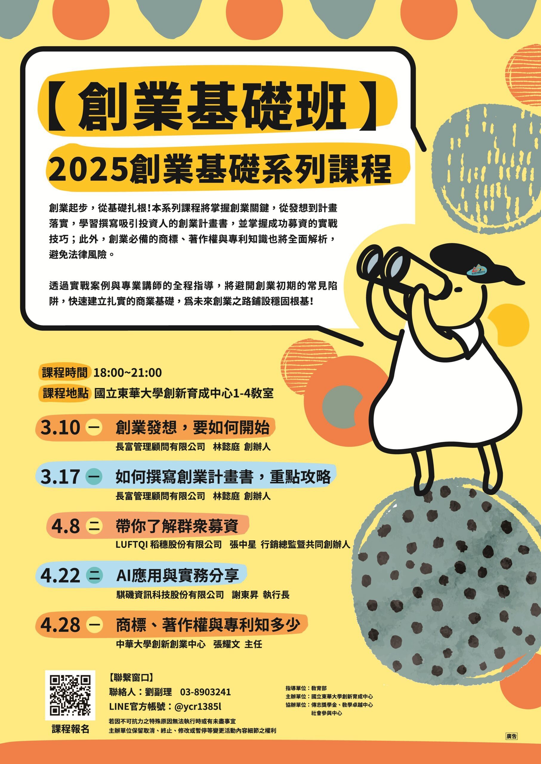 2025創業基礎系列課程,採取帶狀規劃,共安排五大主題,分別為:「創業發想,要如何開始」、「如何撰寫創業計畫書,重點攻略」、「帶你了解群眾募資」、「AI應用與實務分享」、「商標、著作權與專利知多少」。課程特別邀請具備實務經驗的業界專家與顧問進行分享與交流,內容兼具理論與應用。 課程從最初的創業發想切入,幫助學員掌握如何尋找題目、建立方向、凝聚團隊,再逐步引導至創業計畫書的架構、重點及工具運用,協助學員能將想法落實為具體計畫。針對希望參加創業競賽或有意創業的學生團隊,這些內容都能提供直接的指引與支持。 除核心的創業基礎知識外,課程亦涵蓋群眾募資、AI應用及智慧財產權等實務議題,拓展學員的視野,並使其具備基礎理解與應對能力。透過多元課程的設計,不僅加深學員對創業流程的全貌認識,也培養其在實際操作中的敏感度與解決問題的能力。 本系列課程吸引了學生踴躍參與,課堂中互動踴躍,討論熱烈,顯示出學生對創業議題的高度興趣與需求,達到提升學生創業知能與激發創業動能的目標。 |